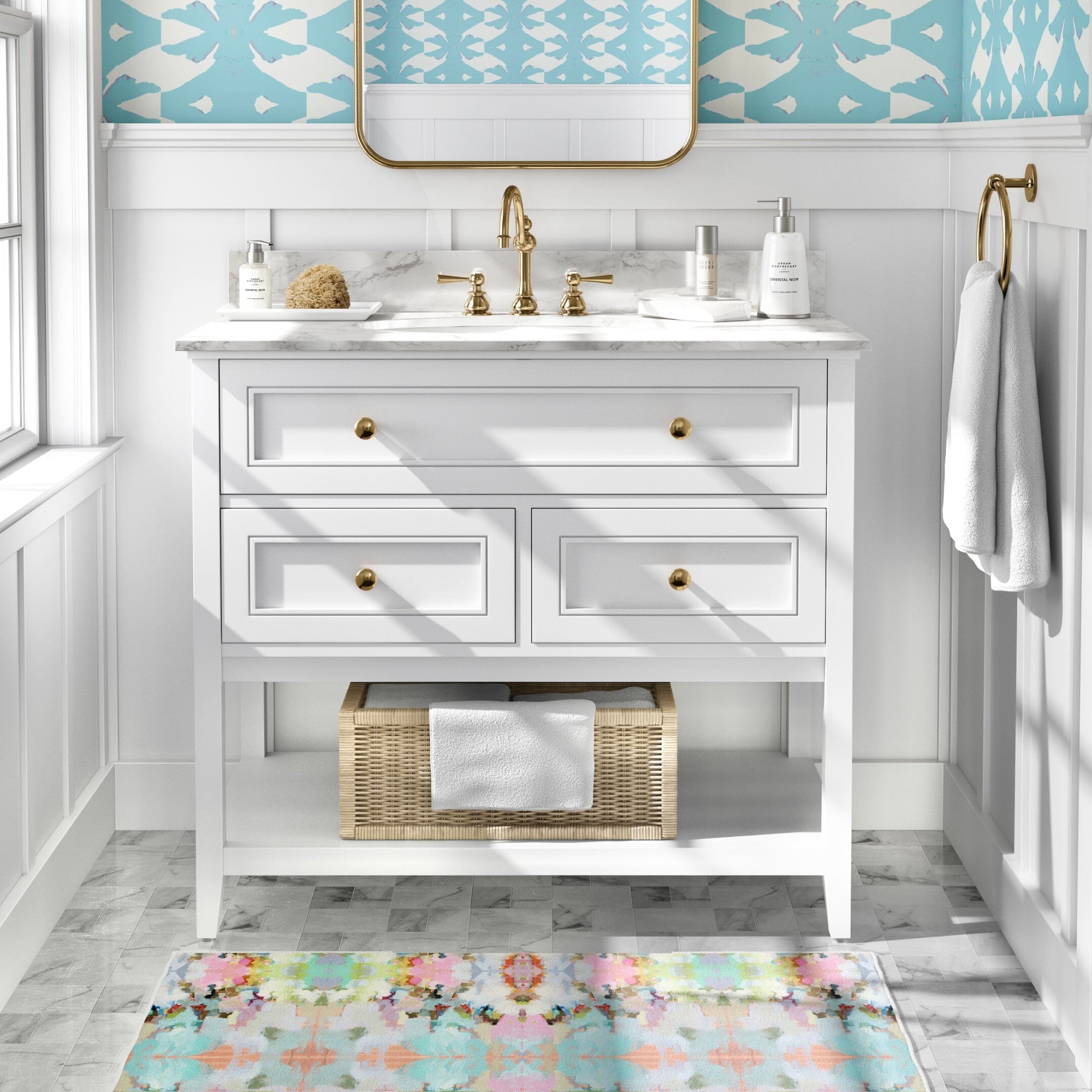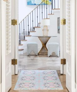 The Brooks Avenue floor mat showcases Laura Park’s signature approach to color, pairing vibrant blue and pink with subtle green accents. Durable and easy to live with, it’s a functional accent for kitchens, bathrooms, and entryways.