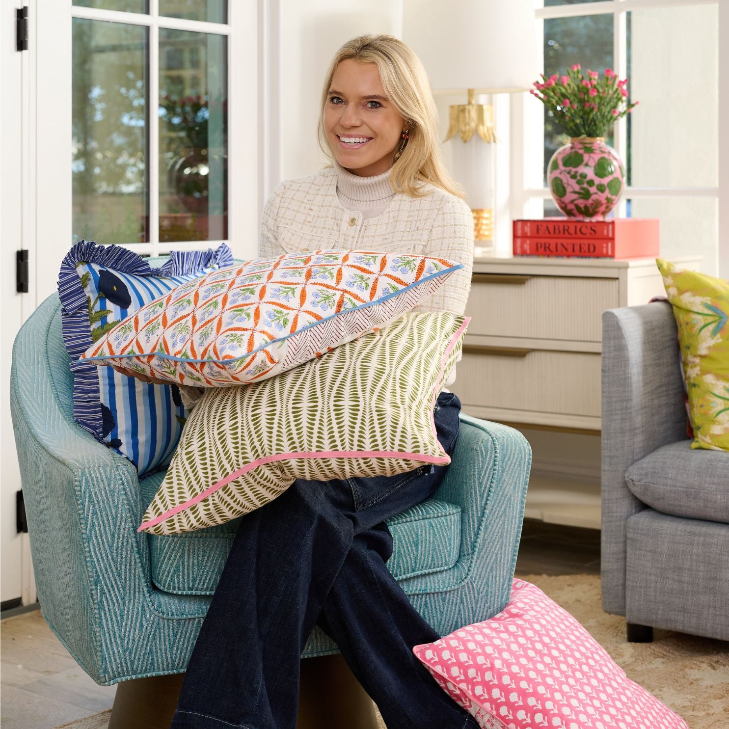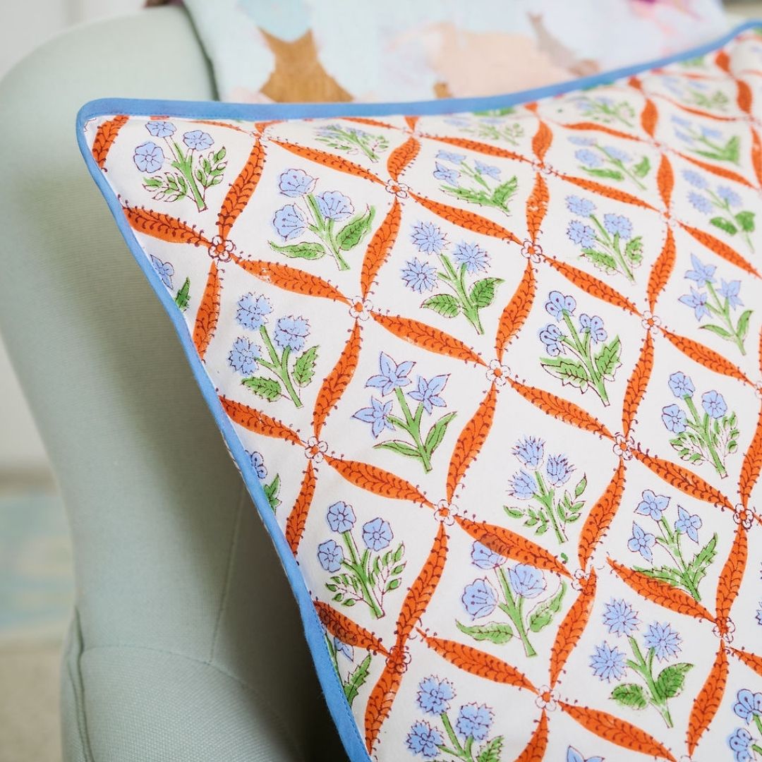 Meet our block print accent pillows! On a recent trip to India with Laura’s daughter, Sumner, the two journeyed through the bustling markets of Delhi, Jaipur, and Udaipur. Through their travels, the Camilla Orange Accent Pillow was born – inspired by the colorful hues of Indian architecture, along with the cherished memories, adventures and culture of India. These pillows are designed to mix and match with your favorite Laura Park patterns, seamlessly fitting into any space in your home, from the sofa to the patio.