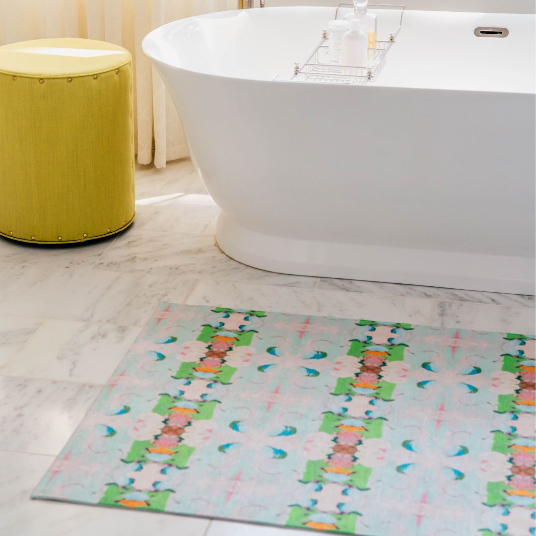 The Monet’s Garden Green floor mat features Laura Park’s signature use of color, combining warm orange and green tones with soft blue accents. Durable and artful, it’s designed for high-traffic spaces like kitchens, baths, and entryways.