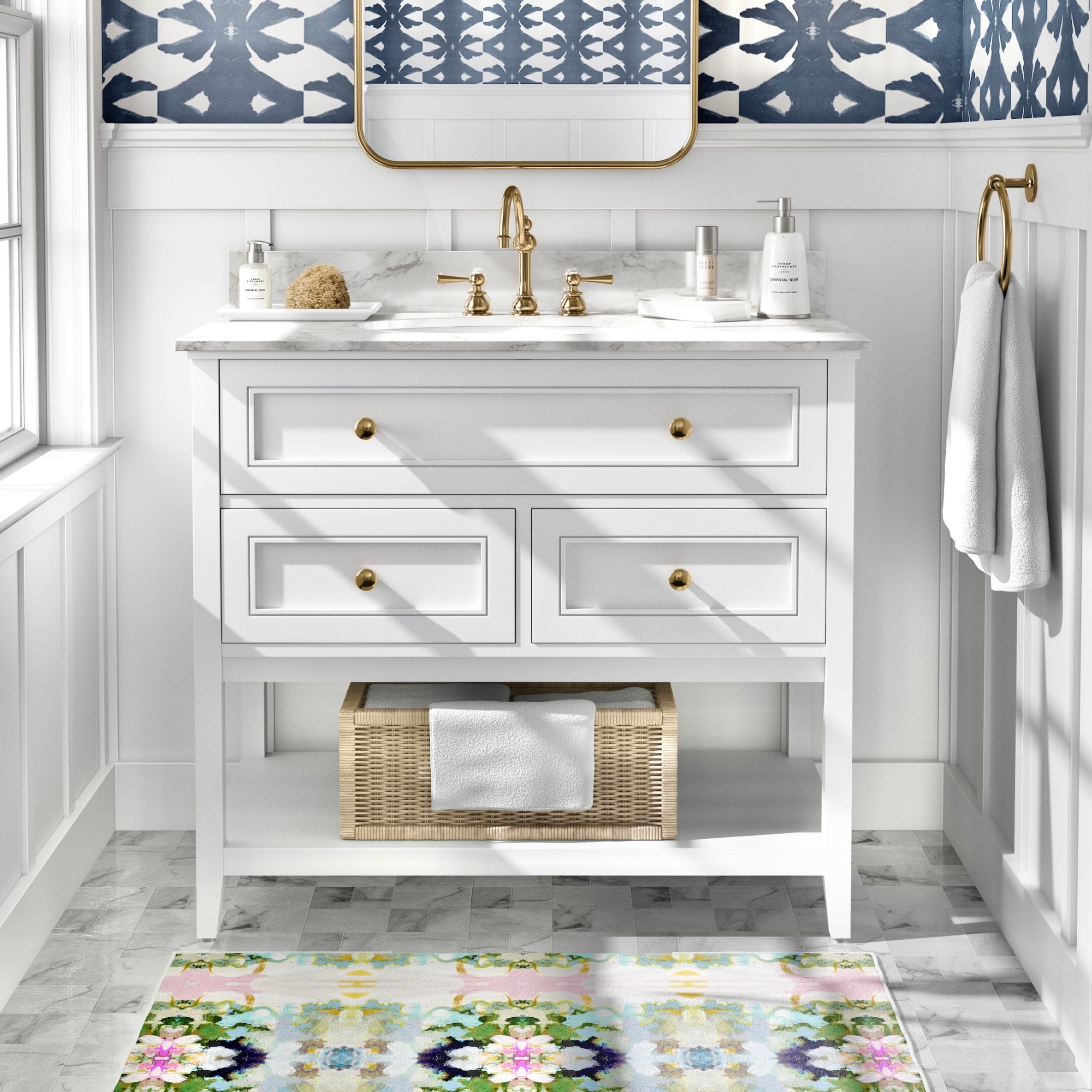 Inspired by Laura Park’s original artwork, the Amber Fresco floor mat pairs vibrant pinks and navy with subtle blue-green hues. Designed for everyday use, it brings color and personality to kitchens, bathrooms, and entryways.