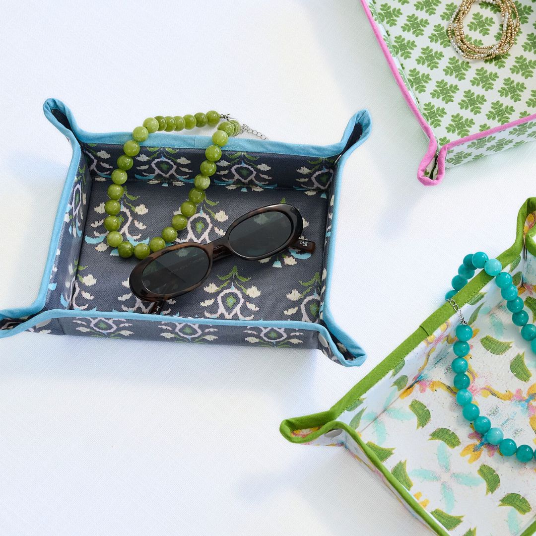 A polished catchall in our Rosemary Stripe Indigo print, featuring deep indigo tones with soft blue and green detail. Finished with a crisp contrast trim, this snap tray is perfect for holding keys, jewelry, or everyday essentials.