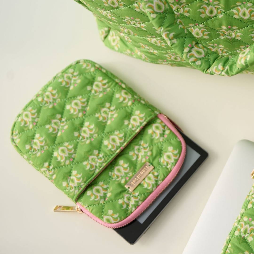 A charming quilted e-reader case in our Rosemary Meadow print, featuring fresh green and bright pink. Lightly padded with a slim profile and an exterior pocket for small essentials, it’s a beautiful way to protect your e-reader — including Kindle® devices — whether you’re reading at home or on the go.