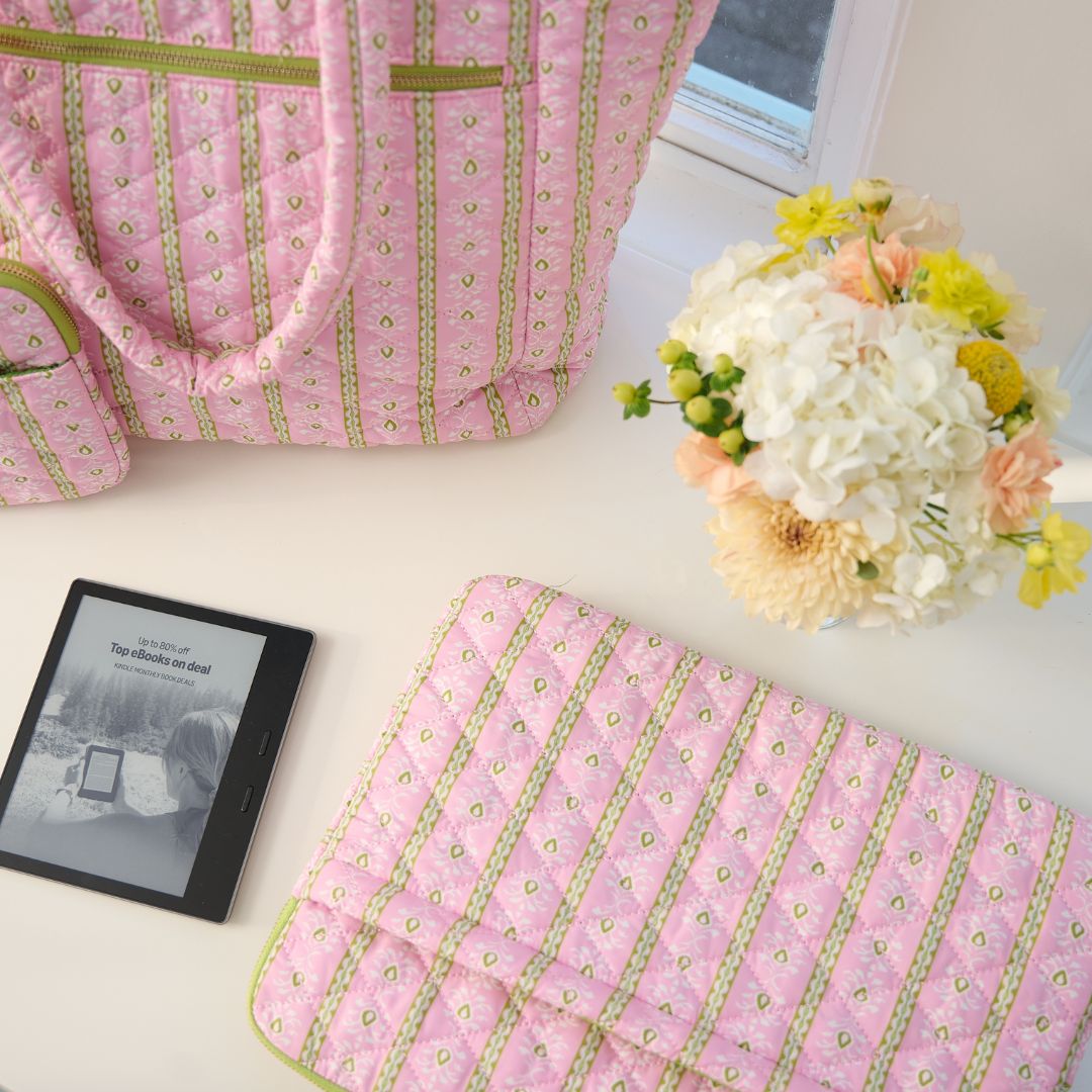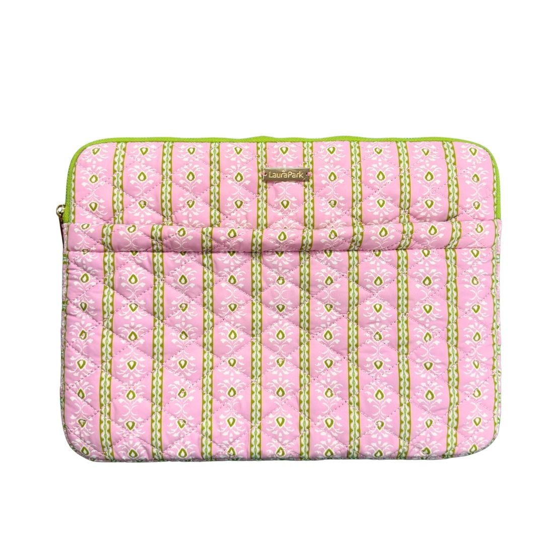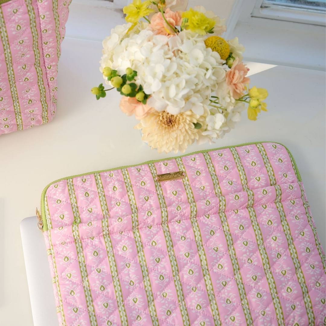 A cheerful quilted laptop case in our Rosemary Stripe Pink print, designed to bring a little color to workdays and travel alike. Softly padded with a slim profile and an exterior pocket to keep essentials close.