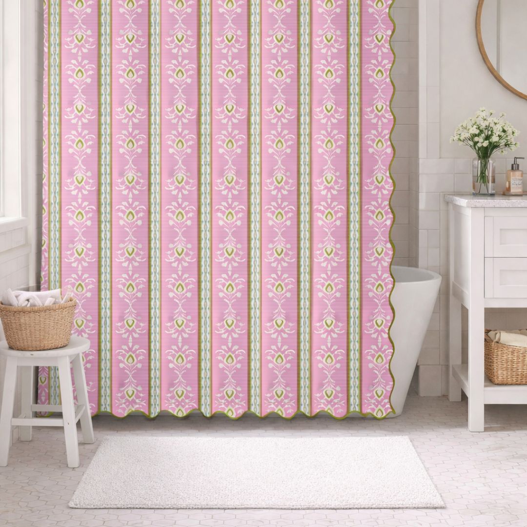 Soft pink layered with fresh green stripes bring a playful, polished look to this Rosemary Stripe Pink shower curtain. Finished with a scalloped edge and contrast trim, it adds color, pattern, and a signature Laura Park detail to the bath.