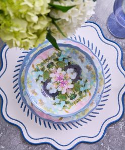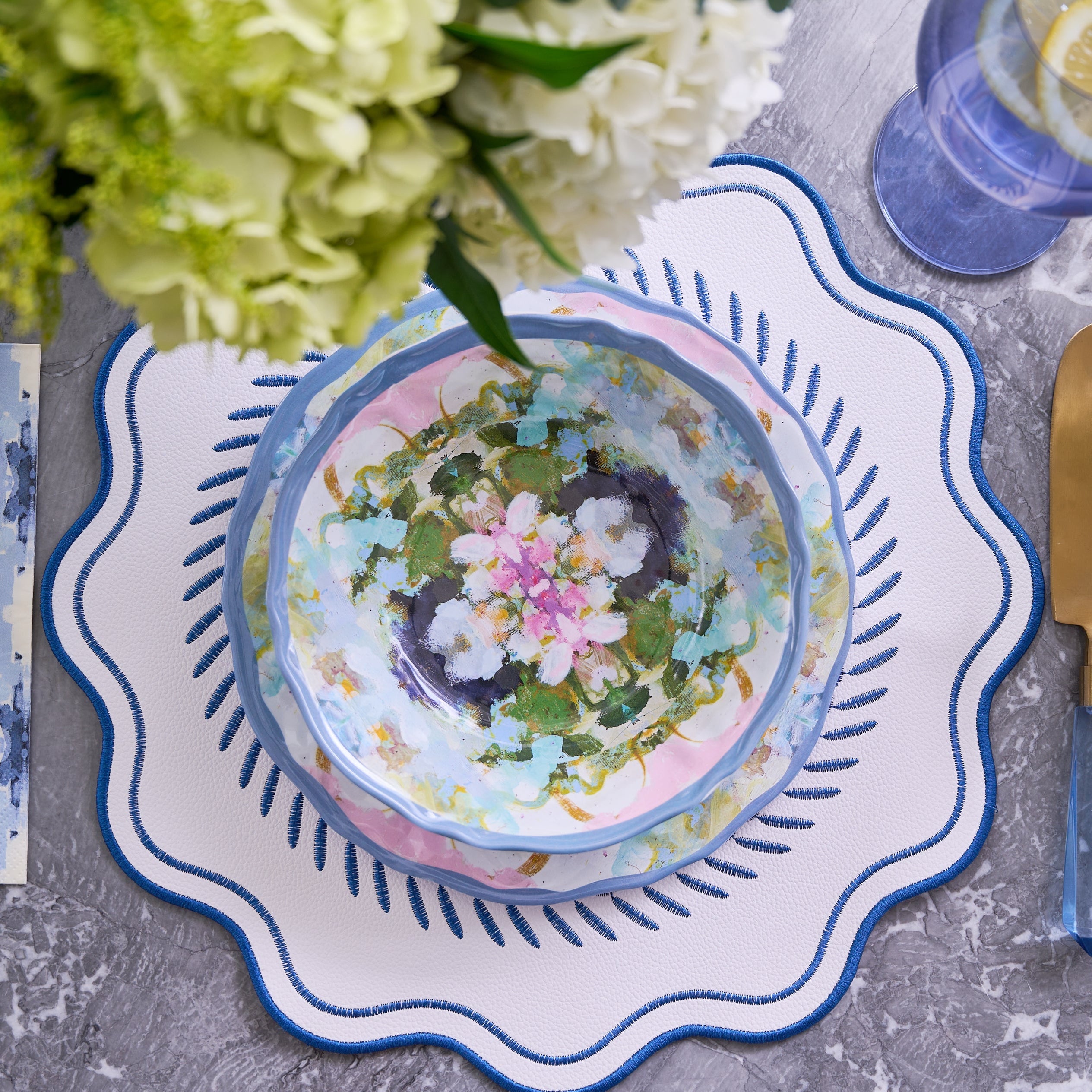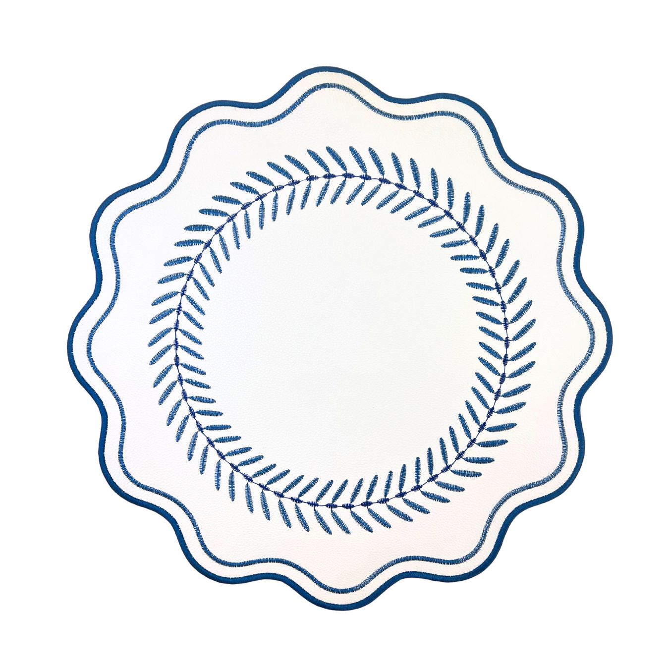 Bring refined charm to your table with our Scalloped Embroidered Feather Placemats by SumnerEdit. Made from durable, wipeable pebbled PVC, each placemat features a graceful feather motif embroidered in classic navy on crisp white, forming a wreath-like border. The scalloped edge adds a touch of softness—perfect for everything from beachside brunches to candlelit dinners.