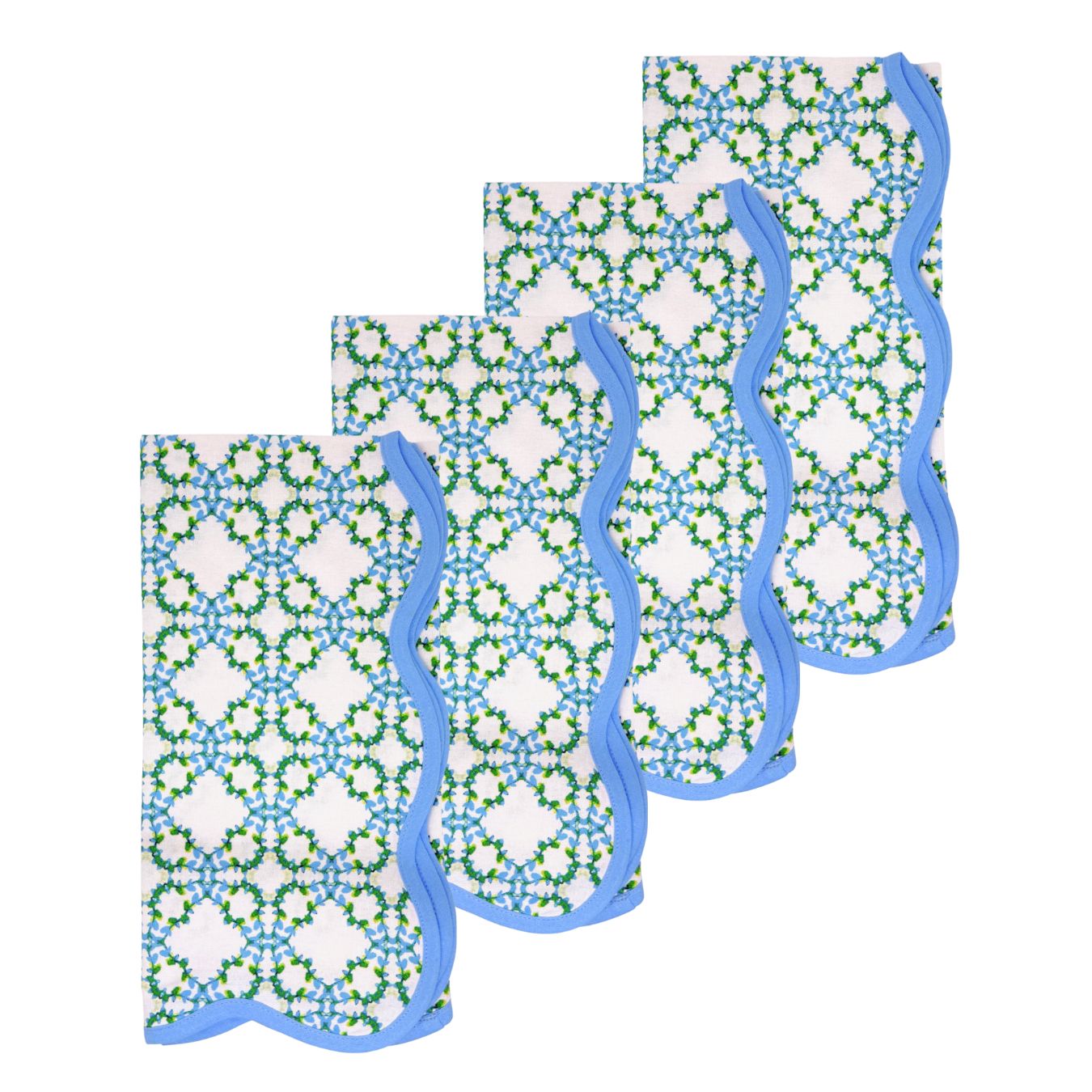Brighten your table with the Ski Bunny Scalloped Dinner Napkins, featuring Laura Park’s trellis-inspired print in soft blue and green with a playful pop of sky-blue trim. Crafted from a cotton-linen blend, this set of four brings an artful twist to everyday dining and special occasions alike. Layer with your favorite table linens for a fresh, colorful tablescape.