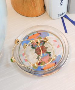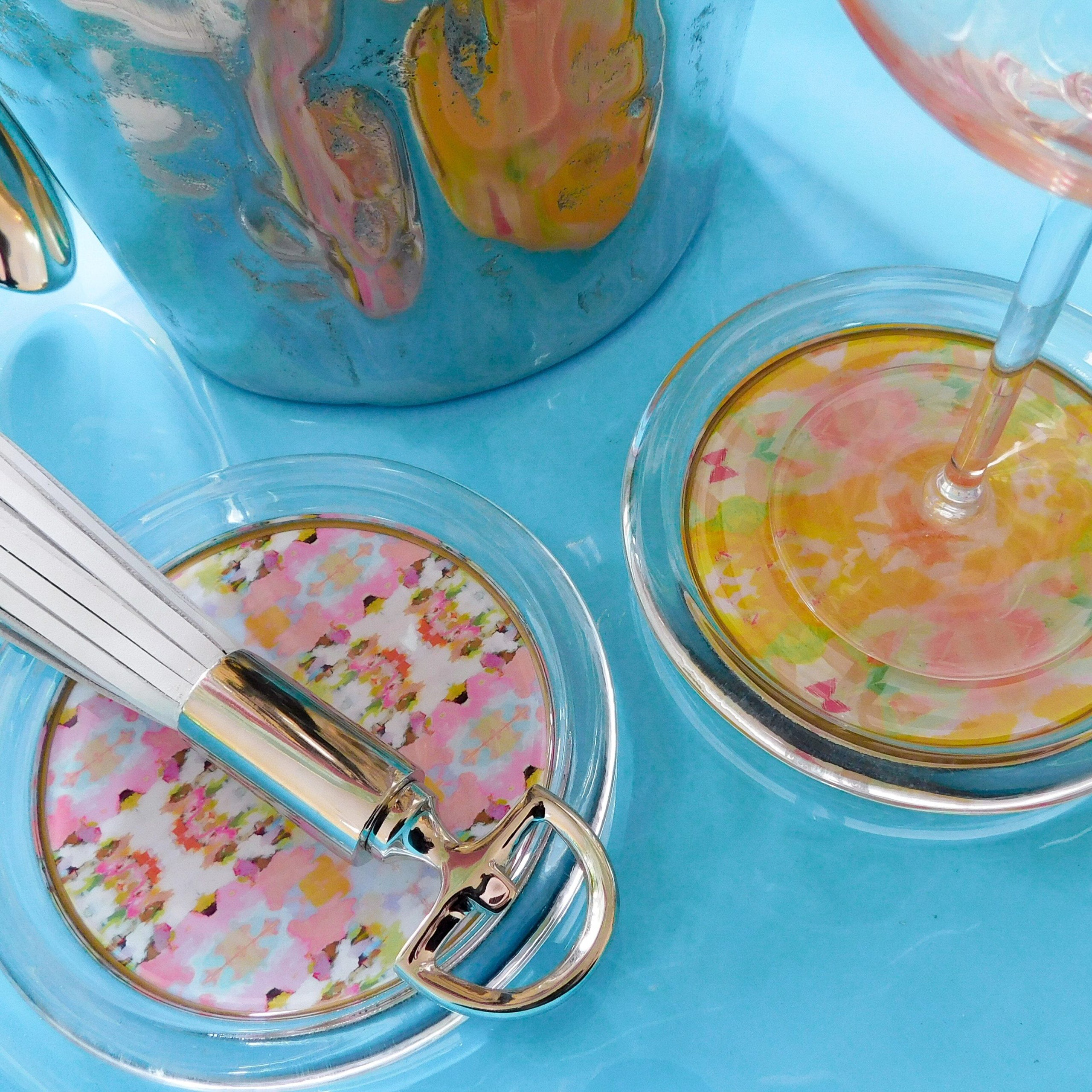 These large decorative coasters are perfect for holding wine bottles, larger glasses and can double as a small trinket dish! Our vibrant design is overlaid with a glass finish to protect the pattern. The bottom features a velvet finish to prevent scratching.